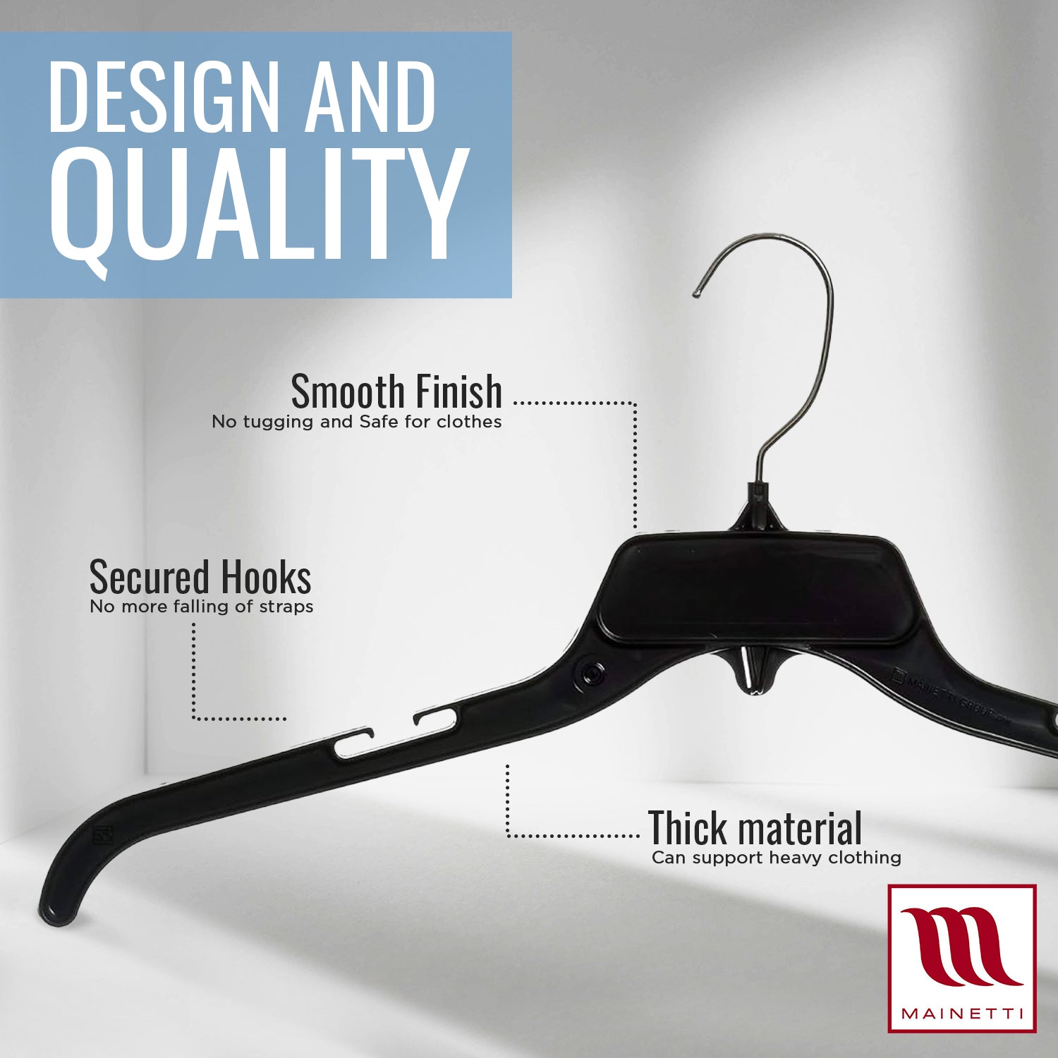 We are Mainetti. The most diverse full-service supplier of retail solutions. We are an innovator in garment hangers for famous names in retail and apparel. We pride ourselves in product sustainability and innovation across the global supply chain - from hangers to polybags, packaging labels, and RFID technology.